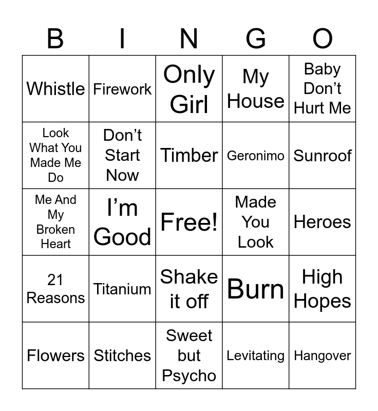 This bingo card has a free space and 33 words: Love You Like A Love Song, Can’t Get You out of My Head, I’m Good, Dance The Night, 21 Reasons, Don’t Start Now, Baby Don’t Hurt Me, Flowers, Firework, Feel This Moment, Timber, Only Girl, Dark Horse, The Motto, Made You Look, Sunroof, Stitches, Me And My Broken Heart, Titanium, Burn, Shake it off, Glad You Came, Whistle, Heroes, Sweet but Psycho, Hangover, My House, Geronimo, Look What You Made Me Do, High Hopes, Havana, Levitating and Attention.