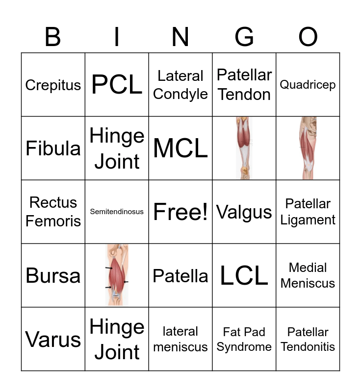 This bingo card has 3 images, a free space and 23 words: Patella, Fat Pad Syndrome, MCL, Hinge Joint, Quadricep, Crepitus, Fibula, PCL, Patellar Ligament, LCL, Rectus Femoris, Medial Meniscus, Varus, Semitendinosus, Tibial Tuberosity, Patellar Tendon, Bursa, Lateral Condyle, Patellar Tendonitis, lateral meniscus, Valgus, Hinge Joint and Treatment for ACL.