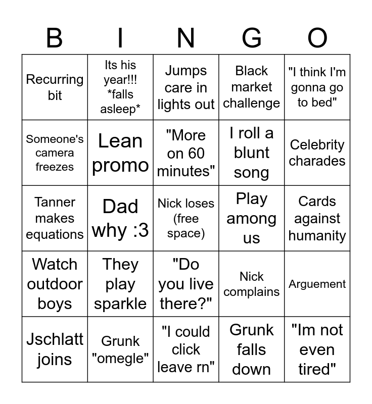 This bingo card has a free space and 25 words: They play sparkle, "I could click leave rn", "More on 60 minutes", Jschlatt joins, "I think I'm gonna go to bed", Recurring bit, Someone's camera freezes, Its his year!!! *falls asleep*, Play among us, "Do you live there?", I roll a blunt song, Tanner makes equations, Nick complains, Arguement, Lean promo, Nick tries to skip intro, Cards against humanity, Jumps care in lights out, Celebrity charades, Dad why :3, "Im not even tired", Grunk "omegle", Watch outdoor boys, Black market challenge and Grunk falls down.