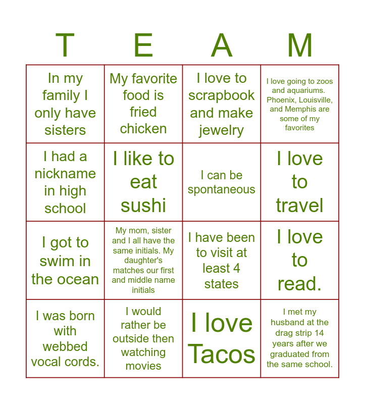 This bingo card has 25 words: I love to go Camping, I played an instrument in school, I love to travel, I love to go to concerts and live shows., I had a nickname in high school, In my family I only have sisters, I like to eat sushi, My favorite food is fried chicken, I would rather be outside then watching movies, I love to go shopping, I got to swim in the ocean, I have been to visit at least 4 states, Criminal Justice is my favorite subject, I have been to Vegas, I can be spontaneous, I played basketball in high school, I love Tacos, I love to scrapbook and make jewelry, My mom, sister and I all have the same initials. My daughter's matches our first and middle name initials, I love to read., I was born with webbed vocal cords., I spent my birthday in Paris., I met my husband at the drag strip 14 years after we graduated from the same school., I love going to zoos and aquariums. Phoenix, Louisville, and Memphis are some of my favorites and One of my favorite TV series is “In the Heat of the Night”.