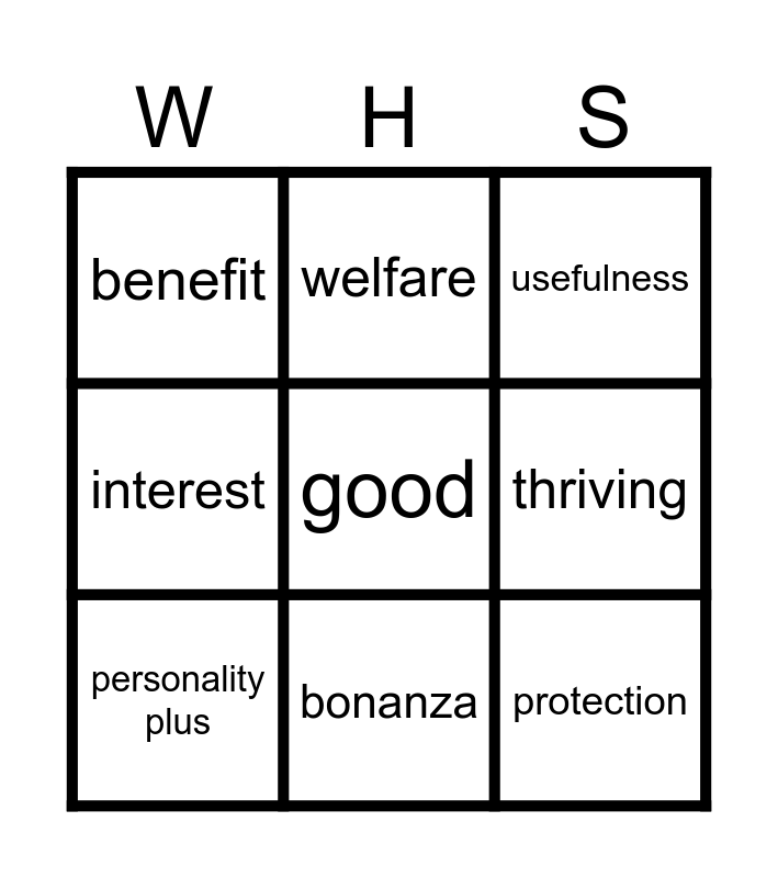 This bingo card has 72 words: health, welfare, comfort, good, happiness, prosperity, interest, profit, protection, safety, security, success, advantage, benefit, fortune, ease, successfulness, good, health, good fortune, satisfaction, favour, gain, blessing, help, service, assistance, enjoyment, progress, nutritional, strengthening, health-giving, purpose, wellbeing fitness, robustness, gratification, healthiness, luck, thriving, interests, best interests, value, greater good, goodness, joy, grace, relief, delight, solace, joyfulness, pleasure, growth, windfall, merit, reward, mileage, usefulness, bonanza, stroke of luck, good thing, gift, pro support, helpfulness, effectiveness, gorgous, extremely good looking, personality plus, simply the best, amazing, talent, smart and confident.