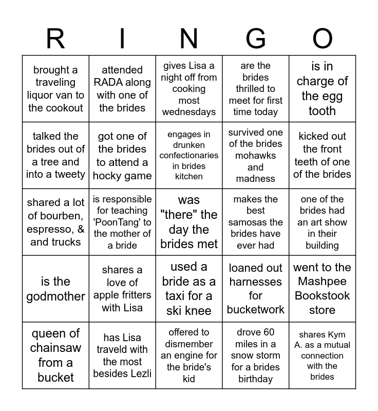 This bingo card has a free space and 24 words: shares a love of apple fritters with Lisa, has Lisa traveld with the most besides Lezli, engages in drunken confectionaries in brides kitchen, queen of chainsaw from a bucket, is in charge of the egg tooth, brought a traveling liquor van to the cookout, talked the brides out of a tree and into a tweety, attended RADA along with one of the brides, makes the best samosas the brides have ever had, used a bride as a taxi for a ski knee, survived one of the brides mohawks and madness, shared a lot of bourben, espresso, & and trucks, loaned out harnesses for bucketwork, went to the Mashpee Bookstook store, got one of the brides to attend a hocky game, drove 60 miles in a snow storm for a brides birthday, one of the brides had an art show in their building, gives Lisa a night off from cooking most wednesdays, kicked out the front teeth of one of the brides, is responsible for teaching 'PoonTang' to the mother of a bride, shares Kym A. as a mutual connection with the brides, is the godmother, are the brides thrilled to meet for first time today and offered to dismember an engine for the bride's kid.