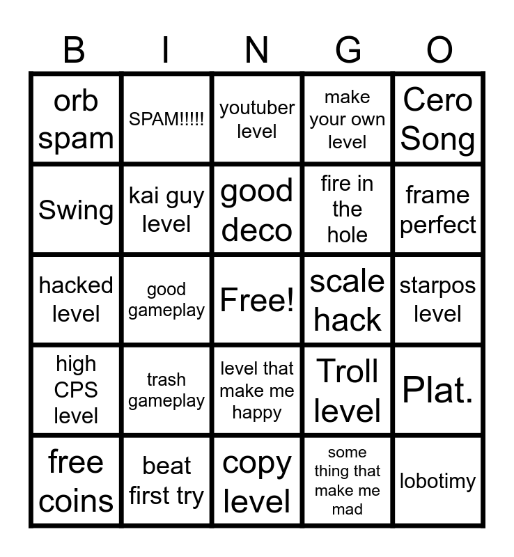 This bingo card has a free space and 24 words: free coins, trash gameplay, good deco, some thing that make me mad, Cero Song, orb spam, SPAM!!!!!, youtuber level, scale hack, starpos level, hacked level, kai guy level, Troll level, Plat., Swing, beat first try, copy level, make your own level, frame perfect, high CPS level, good gameplay, level that make me happy, fire in the hole and lobotimy.