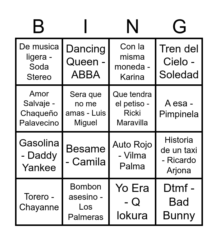 This bingo card has 16 words: Bombon asesino - Los Palmeras, Historia de un taxi - Ricardo Arjona, Con la misma moneda - Karina, De musica ligera - Soda Stereo, Gasolina - Daddy Yankee, Dancing Queen - ABBA, Auto Rojo - Vilma Palma, Yo Era - Q lokura, Amor Salvaje - Chaqueño Palavecino, Sera que no me amas - Luis Miguel, Torero - Chayanne, Tren del Cielo - Soledad, Besame - Camila, A esa - Pimpinela, Que tendra el petiso - Ricki Maravilla and Dtmf - Bad Bunny.