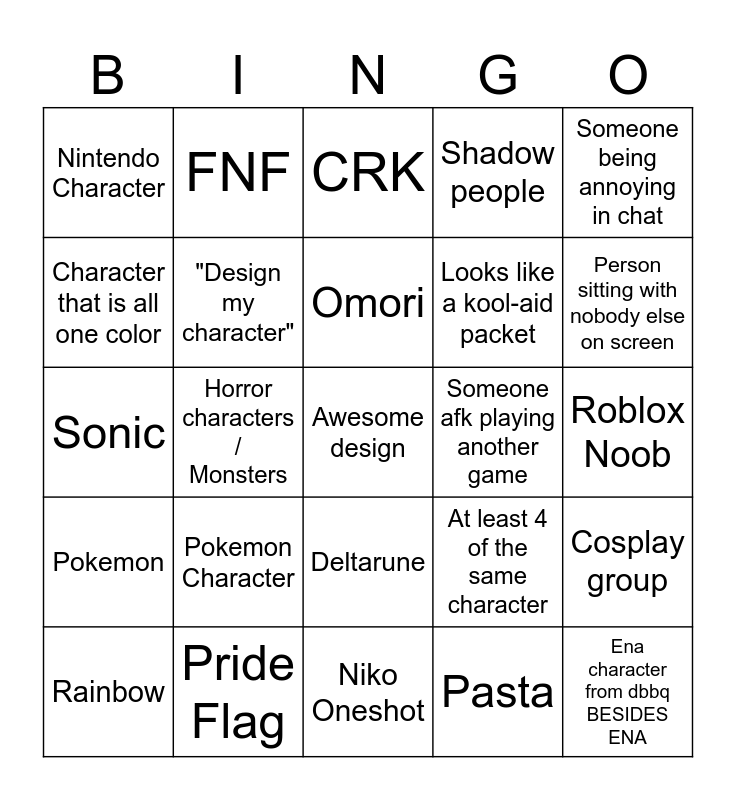 This bingo card has a free space and 89 words: Murder Drones, Vocaloid, Deltarune, Meme character, Default character, Madoka Magica, Someone actually from MLP show, Object show character, OC, Gravity falls, Cartoon character, Statue (Like mossy stone), Cosplay group, Roblox Noob, FNAF, Omori, Grass/Invis, Eyestrain, Minecraft, Ena, Undertale, ISAT, Niko Oneshot, DDLC, Sonic, Pride Flag, Anime, Movie, Cat, like not a cat girl, just a cat, Specific Roblox Game, Shadow people, Horror characters / Monsters, PJSK, Nintendo Character, TADC, CRK, Character that is all one color, Shark, Person sitting with nobody else on screen, Rainbow, Pokemon, Someone eating, Bendy, Someone crying, At least 4 of the same character, Someone afk playing another game, Cosplay you wouldn't expect to find, Different language, Not shaded, FNF, Unfinished character, People breaking safeserver rules in any way, Line of people, 2 characters that are shipped together next to eachother, BFNIF, Fnaf character but specifically a nightmare variant, Kirby, Sanrio, Jax Burga, Someone dressed like a fruit (not gay people just like an actual fruit), Cute but creepy (indie game), Someone random interacts with you, Hampster Pomni, Someone on screen uses a wolf emoji in their chat message, SFAWTDE, NSO, Vaguely looks like one of our OC's, Homestuck, Looks like they would eat 13 pounds of protein powder, Pokemon Character, Ena character from dbbq BESIDES ENA, Has the same color palete as egg, Looks like a deer that would get run over by someone with beer (Dess), Looks like a kool-aid packet, "Design my character", Pasta, Riggy, A character that you know that is so stylized that you couldn't tell until you read the name, Weird Shaped head, Someone who mentions their sexuality in their username, Someone being annoying in chat, You interact with someone, Someone tries to get around swearing, You find one of these bingos but you HAVE TO BE IN SOMEWHERE! Like a store or library., Hollow Knight, Someone with the same avatar as you, Joke name, Someone is playing from school and Someone says song lyrics in chat.