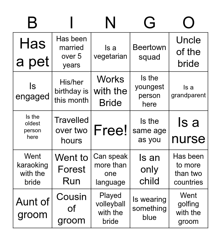 This bingo card has a free space and 24 words: Went to Forest Run, Cousin of groom, Works with the Bride, Aunt of groom, Uncle of the bride, Has a pet, Is engaged, Has been married over 5 years, Is the same age as you, Can speak more than one language, Is the youngest person here, Is the oldest person here, Is an only child, Has been to more than two countries, His/her birthday is this month, Is wearing something blue, Is a nurse, Is a vegetarian, Is a grandparent, Travelled over two hours, Went golfing with the groom, Went karaoking with the bride, Beertown squad and Played volleyball with the bride.