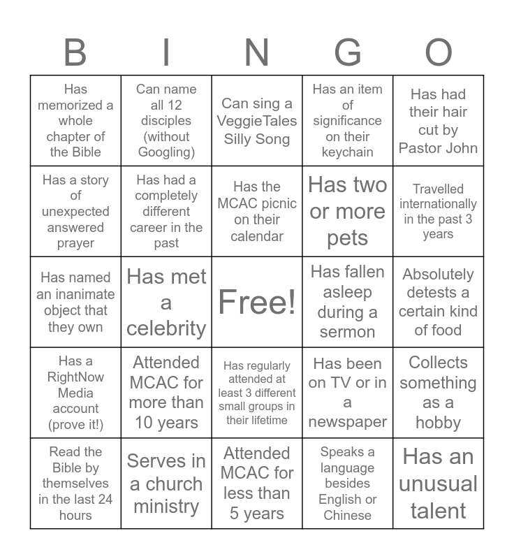 This bingo card has a free space and 24 words: Attended MCAC for more than 10 years, Serves in a church ministry, Has the MCAC picnic on their calendar, Read the Bible by themselves in the last 24 hours, Has had their hair cut by Pastor John, Has memorized a whole chapter of the Bible, Has a story of unexpected answered prayer, Can name all 12 disciples (without Googling), Has fallen asleep during a sermon, Has regularly attended at least 3 different small groups in their lifetime, Has two or more pets, Has named an inanimate object that they own, Has been on TV or in a newspaper, Collects something as a hobby, Has had a completely different career in the past, Speaks a language besides English or Chinese, Absolutely detests a certain kind of food, Can sing a VeggieTales Silly Song, Travelled internationally in the past 3 years, Has met a celebrity, Has an unusual talent, Has a RightNow Media account (prove it!), Has an item of significance on their keychain and Attended MCAC for less than 5 years.