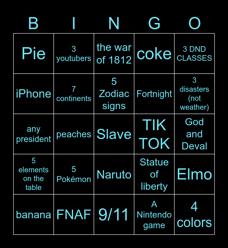 This bingo card has a free space and 24 words: 5 Pokémon, FNAF, 5 Zodiac signs, banana, 3 DND CLASSES, Pie, iPhone, 3 youtubers, TIK TOK, Naruto, Fortnight, any president, Statue of liberty, Elmo, 7 continents, A Nintendo game, God and Deval, the war of 1812, 3 disasters (not weather), peaches, 4 colors, 5 elements on the table, coke and 9/11.