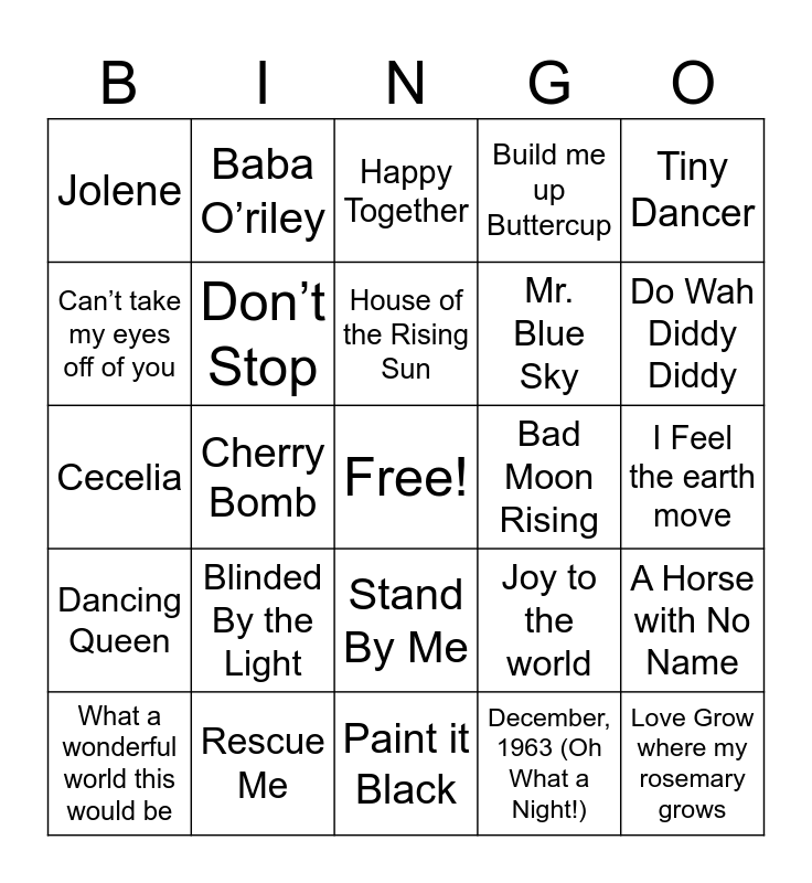 This bingo card has a free space and 54 words: California Dreamin, Dancing Queen, Fortunate Son, Ain’t No Mountain High Enough, Stand By Me, Unchained Melody, Build me up Buttercup, Can’t help falling in Love, Can’t take my eyes off of you, I Got You Babe, Jolene, My girl, Rescue Me, What a wonderful world this would be, Here Comes the sun, Paint it Black, Love Grow where my rosemary grows, Mr. Blue Sky, Sweet Caroline, I Feel the earth move, Joy to the world, Jeremiah was a bullfrog, Bad Moon Rising, Tiny Dancer, Hooked on a Feeling, Baba O’riley, American Girl, Hold the Line, Listen to the Music, December, 1963 (Oh What a Night!), Fat Bottomed Girls, Stuck in the Middle, (Sittin’ On) the Dock of the Bay, Sugar Sugar, Happy Together, I Got You ( I feel Good), Cecelia, A Horse with No Name, Silver Springs, Don’t Stop, Wheel in the Sky, (Don’t Fear) The Reaper, Magic Carpet Ride, For What it's Worth, Blinded By the Light, Evil Woman, Brown Eyed Girl, Spirit in the Sky, House of the Rising Sun, Cherry Bomb, Do Wah Diddy Diddy, September, Roxanne and My Way.