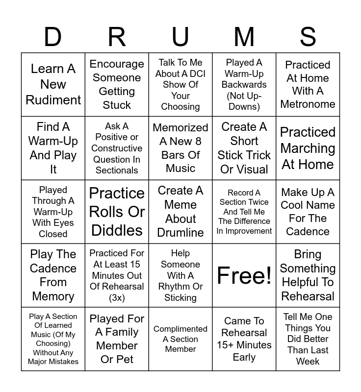 This bingo card has 25 words: Practiced For At Least 15 Minutes Out Of Rehearsal (3x), Complimented A Section Member, Memorized A New 8 Bars Of Music, Play A Section Of Learned Music (Of My Choosing) Without Any Major Mistakes, Practiced At Home With A Metronome, Learn A New Rudiment, Find A Warm-Up And Play It, Encourage Someone Getting Stuck, Record A Section Twice And Tell Me The Difference In Improvement, Help Someone With A Rhythm Or Sticking, Create A Short Stick Trick Or Visual, Played Through A Warm-Up With Eyes Closed, Free!, Bring Something Helpful To Rehearsal, Ask A Positive or Constructive Question In Sectionals, Tell Me One Things You Did Better Than Last Week, Make Up A Cool Name For The Cadence, Talk To Me About A DCI Show Of Your Choosing, Practiced Marching At Home, Practice Rolls Or Diddles, Create A Meme About Drumline, Played For A Family Member Or Pet, Play The Cadence From Memory, Played A Warm-Up Backwards (Not Up-Downs) and Came To Rehearsal 15+ Minutes Early.