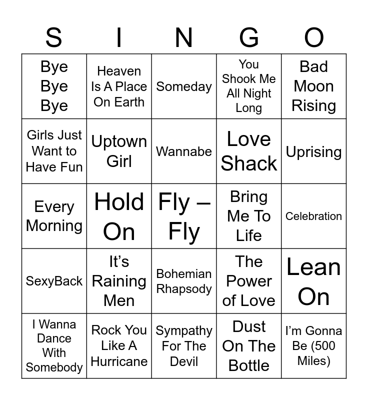 This bingo card has 79 words: Free!, Stacy’s Mom, Someday, New Rules, Edge of Seventeen, Uptown Funk, ABC, Life is a Highway, I’ll Be There for You, Any Way You Want It, Mambo No. 5, All Star, You Shook Me All Night Long, Bye Bye Bye, Don’t Bring Me Down, Girls Just Want to Have Fun, Detroit Rock City, It’s Raining Men, I Love Rock ‘N Roll, Celebration, We Are Never Getting Back Together, Bad Moon Rising, Every Morning, Wannabe, Uptown Girl, Never Gonna Give You Up, That’s the Way It Is, Dude (Looks Like A Lady), Seven Nation Army, Call Me Maybe, Uprising, You Give Love A Bad Name, Sympathy For The Devil, I’m Gonna Be (500 Miles), I Wanna Dance With Somebody, Bring Me To Life, Smells Like Teen Spirit, Cowboy Casanova, Something Like That, Fly – Fly, Your Love, What’s Love Got to Do with It, Material Girl, I Want It That Way, Since U Been Gone, Heaven Is A Place On Earth, Country Girl (Shake It For Me), Baby, Mamma Mia, Sing Ladies (Put a Ring on It), Lean On, Hold On, The Power of Love, 867-5309 / Jenny, Drink In My Hand, Troublemaker, Get the Part Started, Let’s Groove, Shake It Off, Bohemian Rhapsody, Love Shack, Jack & Diane, Come On Eileen, Y.M.C.A., We Found Love, Don’t Stop Belivin’, Dancing Queen, Man! I Feel Like A Woman, Poker Face, SexyBack, Rock You Like A Hurricane, 9 to 5, All Summer Long, Hey Ya!, Basket Case, Dust On The Bottle, We Didn’t Start the Fire, Walking on Sunshine and Believe.
