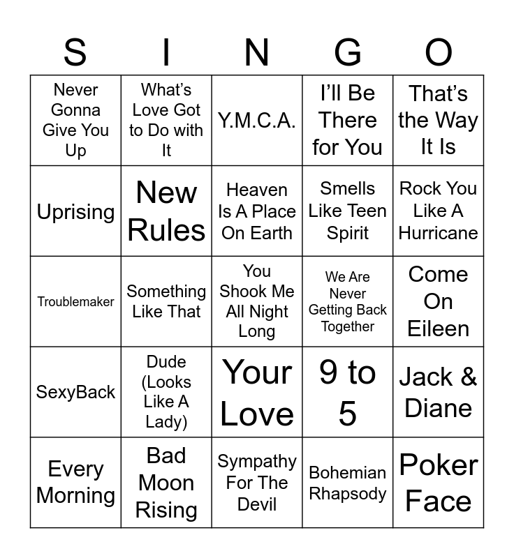 This bingo card has 79 words: Free!, 867-5309 / Jenny, Y.M.C.A., I’m Gonna Be (500 Miles), Don’t Stop Belivin’, Dust On The Bottle, I Wanna Dance With Somebody, Country Girl (Shake It For Me), Baby, Let’s Groove, Get the Part Started, We Found Love, I’ll Be There for You, Never Gonna Give You Up, Basket Case, Uprising, It’s Raining Men, Dude (Looks Like A Lady), Cowboy Casanova, Come On Eileen, Mamma Mia, That’s the Way It Is, Troublemaker, Heaven Is A Place On Earth, New Rules, Hey Ya!, Lean On, Believe, Walking on Sunshine, Bye Bye Bye, Rock You Like A Hurricane, ABC, Sympathy For The Devil, Poker Face, Every Morning, We Are Never Getting Back Together, We Didn’t Start the Fire, Hold On, Call Me Maybe, You Shook Me All Night Long, Girls Just Want to Have Fun, Uptown Funk, Any Way You Want It, All Summer Long, Someday, What’s Love Got to Do with It, Drink In My Hand, Love Shack, I Want It That Way, Bring Me To Life, Jack & Diane, Something Like That, 9 to 5, I Love Rock ‘N Roll, Fly – Fly, Don’t Bring Me Down, You Give Love A Bad Name, The Power of Love, Material Girl, Your Love, Smells Like Teen Spirit, Detroit Rock City, Since U Been Gone, Edge of Seventeen, All Star, Wannabe, Mambo No. 5, Man! I Feel Like A Woman, Life is a Highway, SexyBack, Bad Moon Rising, Seven Nation Army, Stacy’s Mom, Uptown Girl, Celebration, Bohemian Rhapsody, Shake It Off, Sing Ladies (Put a Ring on It) and Dancing Queen.