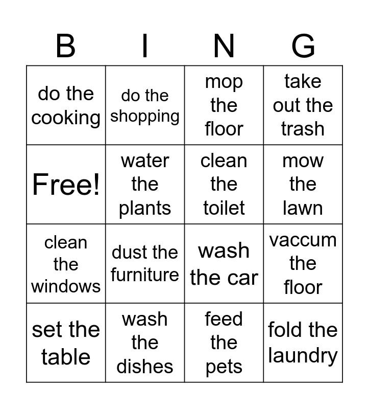 This bingo card has 16 words: wash the dishes, vaccum the floor, mop the floor, do the cooking, clean the windows, do the shopping, wash the car, feed the pets, Free!, water the plants, set the table, take out the trash, dust the furniture, mow the lawn, clean the toilet and fold the laundry.