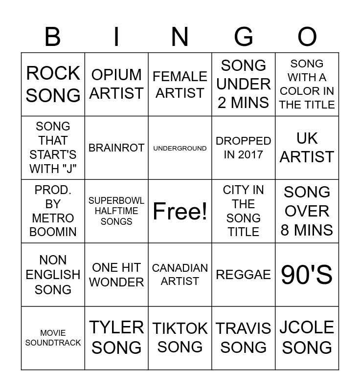 This bingo card has a free space and 24 words: ONE HIT WONDER, TYLER SONG, UNDERGROUND, MOVIE SOUNDTRACK, SONG WITH A COLOR IN THE TITLE, ROCK SONG, SONG THAT START'S WITH "J", OPIUM ARTIST, CITY IN THE SONG TITLE, CANADIAN ARTIST, DROPPED IN 2017, PROD. BY METRO BOOMIN, REGGAE, 90'S, BRAINROT, TRAVIS SONG, SONG OVER 8 MINS, FEMALE ARTIST, UK ARTIST, SUPERBOWL HALFTIME SONGS, JCOLE SONG, NON ENGLISH SONG, SONG UNDER 2 MINS and TIKTOK SONG.