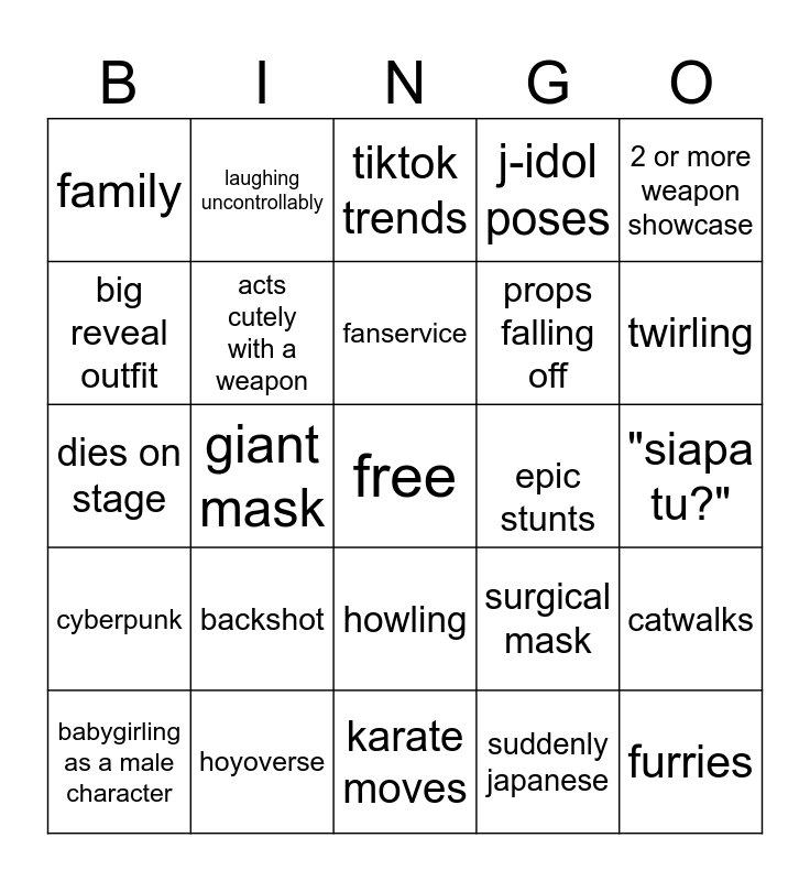 This bingo card has a free space and 39 words: A child cosplaying, couple/duo cosplay, wielding a giant weapon, acts cutely with a weapon, babygirling as a male character, howling, fanservice, awkward standing, 2 or more weapon showcase, cyberpunk, giant mask, j-idol poses, furries, "siapa tu?", epic stunts, backshot, shouting catchphrase, family, character selection stance, surgical mask, big reveal outfit, karate moves, props falling off, twirling, yelling, runs to stage, repeated character, runs off stage, character breakdown, laughing uncontrollably, nya!!, uwu, tiktok trends, hoyoverse, suddenly japanese, intently staring at audience, catwalks, dies on stage and human version of an animal character.