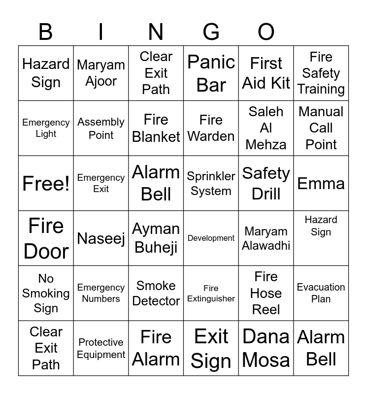 This bingo card has 36 words: Fire Extinguisher, Smoke Detector, Exit Sign, Emergency Light, Fire Door, Sprinkler System, Assembly Point, Fire Alarm, First Aid Kit, Fire Hose Reel, Manual Call Point, Panic Bar, Evacuation Plan, Emergency Exit, Fire Warden, Hazard Sign, No Smoking Sign, Safety Drill, Free!, Clear Exit Path, Alarm Bell, Naseej, Development, Ayman Buheji, Maryam Alawadhi, Maryam Ajoor, Saleh Al Mehza, Protective Equipment, Fire Blanket, Fire Safety Training, Alarm Bell, Clear Exit Path, Hazard Sign, Emma, Emergency Numbers and Dana Mosa.
