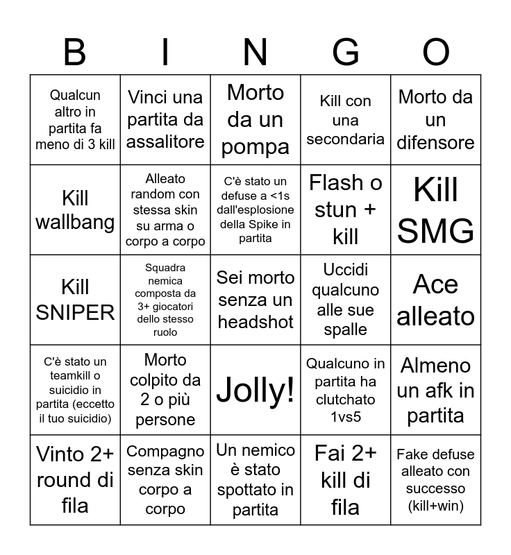 This bingo card has 45 words: Sei morto con un headshot, Sei morto senza un headshot, Kill con op, Vinto 2+ round di fila, Compagno bot, Fai 2+ kill di fila, Morto da un pompa, Morto da un assalitore, Morto da un difensore, Compagno senza skin corpo a corpo, Kill con una secondaria, Uccidi qualcuno alle sue spalle, Jolly!, Morto colpito da 2 o più persone, Scambia la skin di un'arma principale con un random, Un nemico è stato spottato in partita, Kill AR, Kill SNIPER, Kill SHOTGUN, Kill SMG, Vinci una partita da assalitore, Vinci una partita da difensore, Qualcuno in partita fa più di 15 kill, Qualcun altro in partita fa meno di 3 kill, Kill LMG, Ace alleato, Ace nemico, Fai un ace, Qualcuno in partita ha clutchato 1vs5, C'è stato un teamkill o suicidio in partita (eccetto il tuo suicidio), Spike piazzata entro 1s dalla fine del tempo, Almeno un afk in partita, Un random ha insta pickato, Fai un one tap con un solo colpo nel caricatore, Fai un one tap, Squadra nemica composta da 3+ giocatori dello stesso ruolo, Kill SHORTY, Kill PISTOLA, Fake defuse alleato con successo (kill+win), C'è stato un defuse a <1s dall'esplosione della Spike in partita, Kill wallbang, Flash o stun + kill, Fai arrabbiare un random a tal punto che inizi a parlarti, Alleato random con stessa skin su arma o corpo a corpo and Fai un clutch 1vs2+.