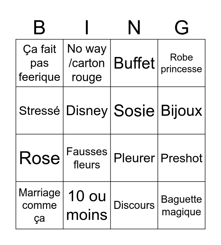 This bingo card has 16 words: 10 ou moins, Preshot, Buffet, Ça fait pas feerique, Rose, No way /carton rouge, Pleurer, Discours, Stressé, Disney, Marriage comme ça, Robe princesse, Fausses fleurs, Bijoux, Sosie and Baguette magique.