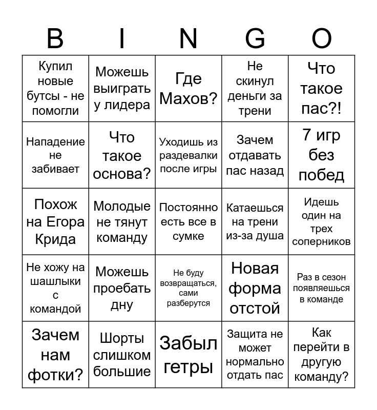 This bingo card has 25 words: Можешь проебать дну, Забыл гетры, Уходишь из раздевалки после игры, Зачем нам фотки?, Что такое пас?!, Купил новые бутсы - не помогли, Нападение не забивает, Можешь выиграть у лидера, Катаешься на трени из-за душа, Не буду возвращаться, сами разберутся, Зачем отдавать пас назад, Похож на Егора Крида, Новая форма отстой, Раз в сезон появляешься в команде, Что такое основа?, Как перейти в другую команду?, Идешь один на трех соперников, Где Махов?, 7 игр без побед, Молодые не тянут команду, Постоянно есть все в сумке, Шорты слишком большие, Не хожу на шашлыки с командой, Не скинул деньги за трени and Защита не может нормально отдать пас.