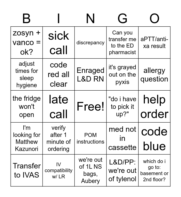This bingo card has a free space and 24 words: verify after 1 minute of ordering, IV compatibility w/ LR, Enraged L&D RN, Transfer to IVAS, aPTT/anti-xa result, zosyn + vanco = ok?, adjust times for sleep hygiene, sick call, "do i have to pick it up?", POM instructions, it's grayed out on the pyxis, the fridge won't open, med not in cassette, code blue, code red all clear, L&D/PP: we're out of tylenol, help order, discrepancy, allergy question, late call, which do i go to: basement or 2nd floor?, I'm looking for Matthew Kazunori, Can you transfer me to the ED pharmacist and we're out of 1L NS bags, Aubery.