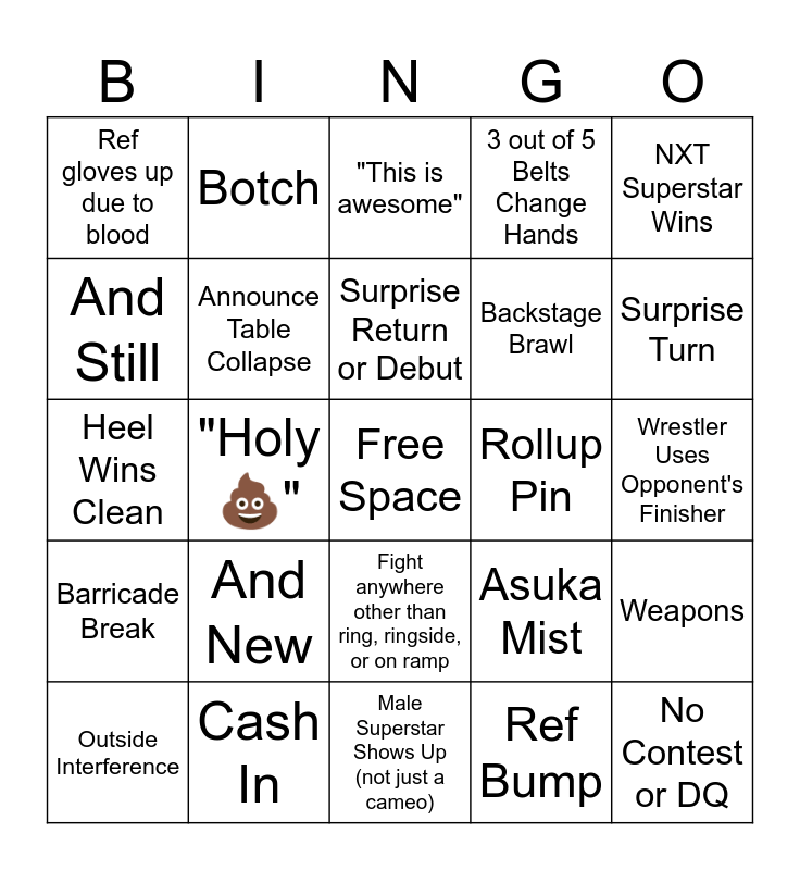 This bingo card has a free space and 24 words: And New, Cash In, Surprise Return or Debut, Outside Interference, NXT Superstar Wins, Ref gloves up due to blood, And Still, Botch, Rollup Pin, Fight anywhere other than ring, ringside, or on ramp, Backstage Brawl, Heel Wins Clean, Asuka Mist, Weapons, Announce Table Collapse, Ref Bump, Wrestler Uses Opponent's Finisher, "This is awesome", Surprise Turn, "Holy 💩", No Contest or DQ, Barricade Break, 3 out of 5 Belts Change Hands and Male Superstar Shows Up (not just a cameo).