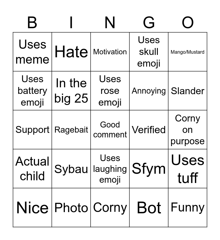 This bingo card has a free space and 24 words: Sybau, Photo, Uses rose emoji, Nice, Mango/Mustard, Uses meme, Uses battery emoji, Hate, Verified, Uses laughing emoji, Annoying, Support, Sfym, Uses tuff, In the big 25, Bot, Corny on purpose, Motivation, Slander, Ragebait, Funny, Actual child, Uses skull emoji and Corny.