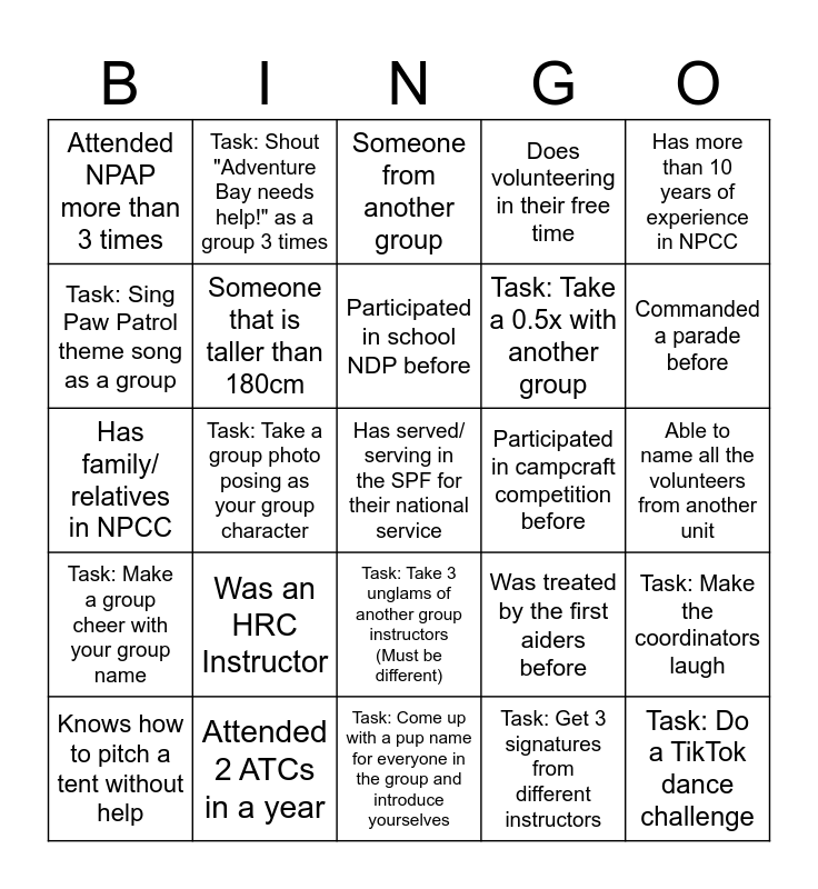 This bingo card has 25 words: Task: Make a group cheer with your group name, Attended 2 ATCs in a year, Has served/ serving in the SPF for their national service, Task: Get 3 signatures from different instructors, Has more than 10 years of experience in NPCC, Attended NPAP more than 3 times, Task: Shout "Adventure Bay needs help!" as a group 3 times, Someone from another group, Participated in campcraft competition before, Task: Make the coordinators laugh, Task: Sing Paw Patrol theme song as a group, Someone that is taller than 180cm, Task: Come up with a pup name for everyone in the group and introduce yourselves, Was treated by the first aiders before, Commanded a parade before, Knows how to pitch a tent without help, Task: Take a group photo posing as your group character, Participated in school NDP before, Task: Take a 0.5x with another group, Able to name all the volunteers from another unit, Has family/ relatives in NPCC, Was an HRC Instructor, Task: Take 3 unglams of another group instructors (Must be different), Does volunteering in their free time and Task: Do a TikTok dance challenge.