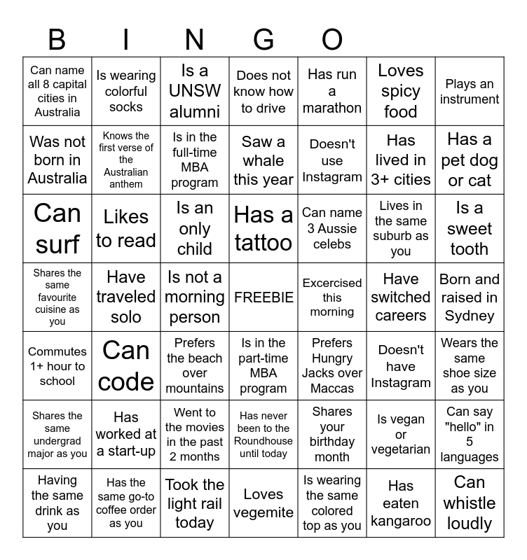 This bingo card has a free space and 48 words: Shares your birthday month, Has lived in 3+ cities, Loves vegemite, Have traveled solo, Is an only child, Born and raised in Sydney, Is wearing colorful socks, Has the same go-to coffee order as you, Loves spicy food, Is in the part-time MBA program, Plays an instrument, Does not know how to drive, Lives in the same suburb as you, Can name 3 Aussie celebs, Shares the same undergrad major as you, Have switched careers, Was not born in Australia, Has a pet dog or cat, Is vegan or vegetarian, Has run a marathon, Doesn't use Instagram, Is not a morning person, Can name all 8 capital cities in Australia, Knows the first verse of the Australian anthem, Can say "hello" in 5 languages, Is in the full-time MBA program, Is a sweet tooth, Having the same drink as you, Has a tattoo, Likes to read, Has eaten kangaroo, Excercised this morning, Wears the same shoe size as you, Has worked at a start-up, Shares the same favourite cuisine as you, Prefers Hungry Jacks over Maccas, Doesn't have Instagram, Can surf, Prefers the beach over mountains, Went to the movies in the past 2 months, Commutes 1+ hour to school, Can whistle loudly, Is a UNSW alumni, Took the light rail today, Saw a whale this year, Has never been to the Roundhouse until today, Can code and Is wearing the same colored top as you.