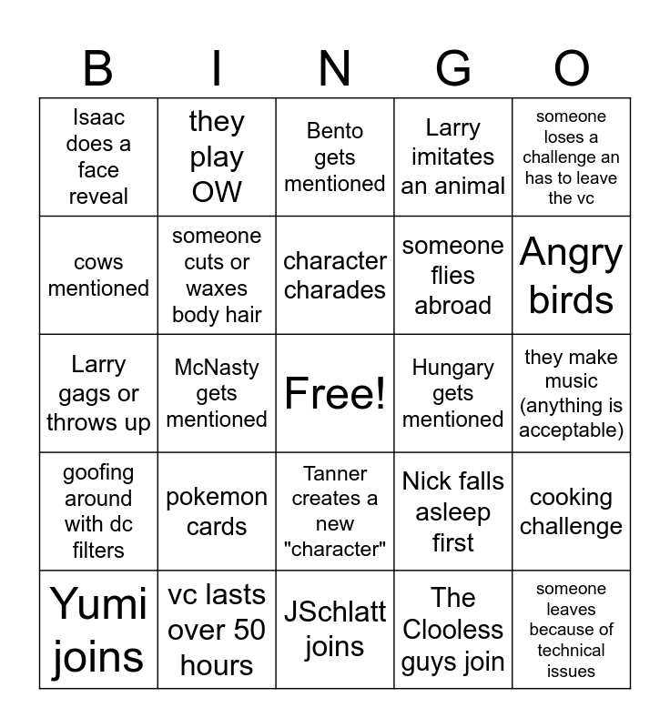 This bingo card has a free space and 24 words: pokemon cards, vc lasts over 50 hours, character charades, Yumi joins, someone loses a challenge an has to leave the vc, Isaac does a face reveal, cows mentioned, they play OW, Hungary gets mentioned, Tanner creates a new "character", someone flies abroad, Larry gags or throws up, Nick falls asleep first, cooking challenge, someone cuts or waxes body hair, The Clooless guys join, they make music (anything is acceptable), Bento gets mentioned, Angry birds, McNasty gets mentioned, someone leaves because of technical issues, goofing around with dc filters, Larry imitates an animal and JSchlatt joins.