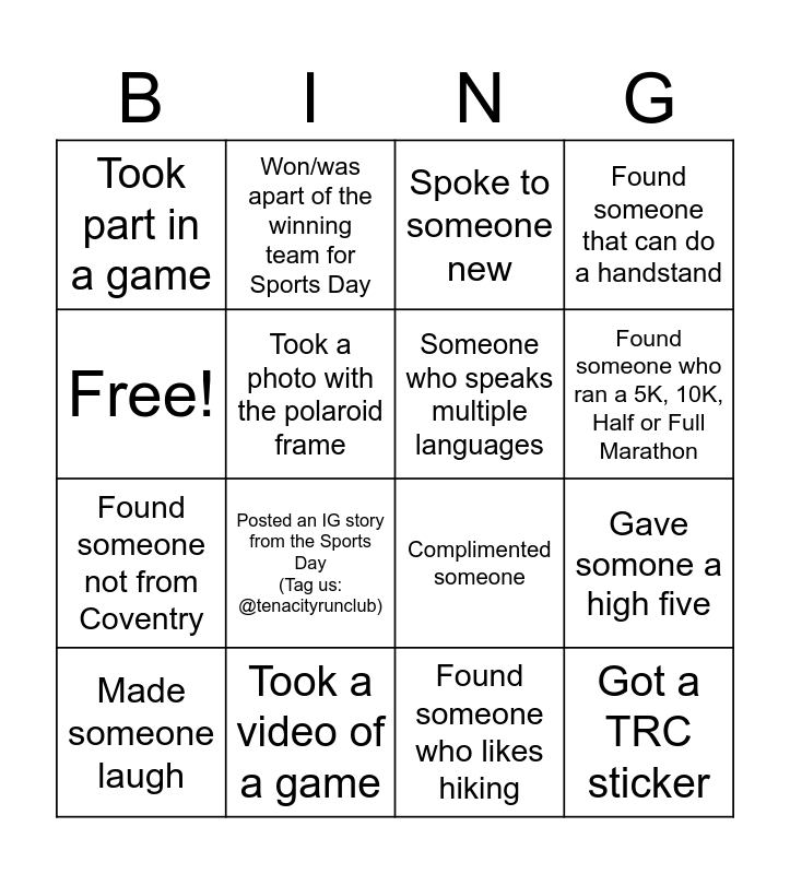 This bingo card has 16 words: Took a video of a game, Gave somone a high five, Spoke to someone new, Took part in a game, Found someone not from Coventry, Won/was apart of the winning team for Sports Day, Complimented someone, Found someone who likes hiking, Free!, Took a photo with the polaroid frame, Made someone laugh, Found someone that can do a handstand, Posted an IG story from the Sports Day (Tag us: @tenacityrunclub), Found someone who ran a 5K, 10K, Half or Full Marathon, Someone who speaks multiple languages and Got a TRC sticker.