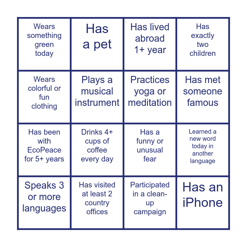 This bingo card has 16 words: Has visited at least 2 country offices, Learned a new word today in another language, Has lived abroad 1+ year, Wears something green today, Has been with EcoPeace for 5+ years, Has a pet, Has a funny or unusual fear, Participated in a clean-up campaign, Wears colorful or fun clothing, Plays a musical instrument, Speaks 3 or more languages, Has exactly two children, Drinks 4+ cups of coffee every day, Has met someone famous, Practices yoga or meditation and Has an iPhone.