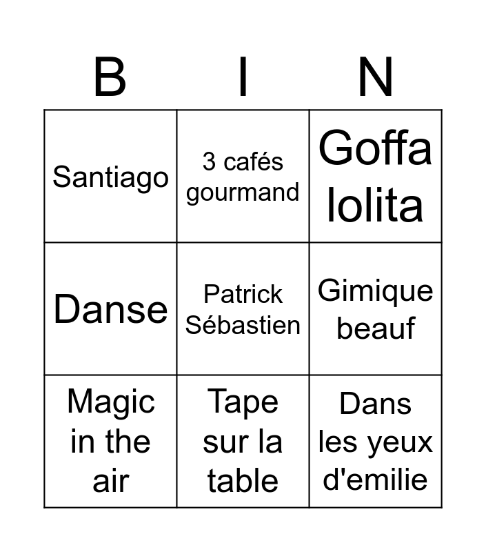 This bingo card has a free space and 8 words: Gimique beauf, Goffa lolita, 3 cafés gourmand, Magic in the air, Santiago, Dans les yeux d'emilie, Danse and Tape sur la table.