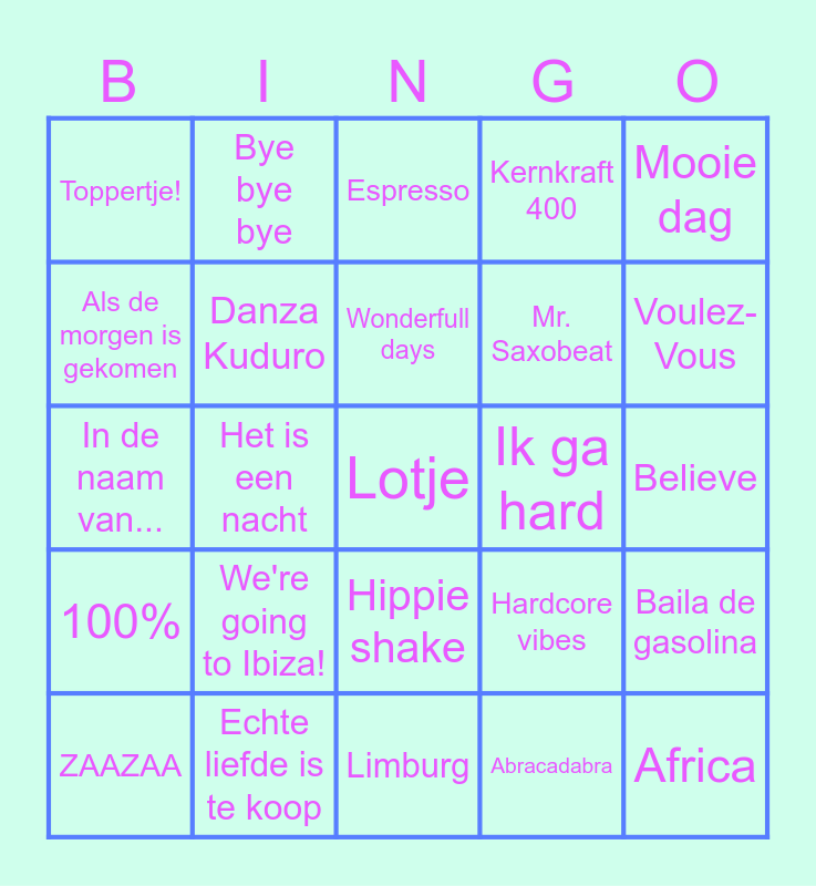 This bingo card has 60 words: APT, Echte liefde is te koop, Blikkendag, 100%, Abracadabra, I gotta feeling, Danza Kuduro, Last friday night, Mr. Saxobeat, LAURA, Kernkraft 400, Schudden, Als de morgen is gekomen, Banger hart, Verliefd zijn, Toppertje!, Lotje, Mooie dag, Piano man, Wonderfull days, Ik ga hard, Espresso, ZAAZAA, Baila de gasolina, After van de after, Goud, Ik heb de hele nacht liggen dromen, Gimme! Gimme! Gimme!, Voulez- Vous, Billie Jean, Follow the leader, Macarena, Bagagedrager, I want it that way, Bye bye bye, Tranquilo, Tequila, Het is een nacht, Even aan mijn moeder vragen, In de naam van..., Rainbow in the sky, We're going to Ibiza!, Believe, Boom, boom, boom, boom!!, Hardcore vibes, I wanna be a hippy, ich bin wie du, Scatman, Rampeneren, Hippie shake, Limburg, Per spoor, Ga dan!, Uit m'n bol, Watskeburt?!, We built this city, Evrybody wants to rule the world, Don't go, Africa and Can't get you outta my head.