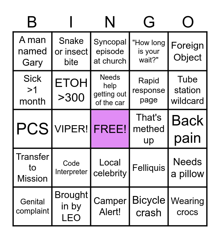 This bingo card has a free space and 24 words: Code Interpreter, Brought in by LEO, Needs help getting out of the car, Genital complaint, Foreign Object, A man named Gary, Sick >1 month, Snake or insect bite, That's methed up, Local celebrity, Rapid response page, PCS, Felliquis, Needs a pillow, ETOH >300, Bicycle crash, Back pain, Syncopal episode at church, Tube station wildcard, VIPER!, Wearing crocs, Transfer to Mission, "How long is your wait?" and Camper Alert!.