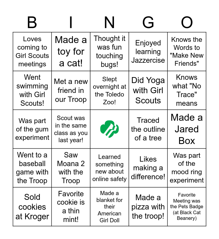 This bingo card has a free space and 39 words: Pet a black cat at Black Cat Beanery, Held a tarantula!, Favorite Meeting was Wicked, Met a new friend in our Troop, Sold cookies at Kroger, Learned something new about online safety, Slept overnight at the Toledo Zoo!, Collected Toys for Toys for Tots, Knows the Words to "Make New Friends", Went to a baseball game with the Troop, Scout was in the same class as you last year!, Enjoyed learning Jazzercise, Favorite Meeting was the Pets Badge (at Black Cat Beanery), Made a Jared Box, Traced the outline of a tree, Saw Moana 2 with the Troop, Was part of the Sharpie marker experiment, Loves coming to Girl Scouts meetings, Went to Moonbeams for Sweet Dreams with the Troop, Likes making a difference!, Went swimming with Girl Scouts!, Made a blanket for their American Girl Doll, Did Yoga with Girl Scouts, Knows what "No Trace" means, Sold Cookies at Great Lakes Crossing, Sold Cookies at Ace, Favorite Meeting was Taylor Swift, Went to the DIA with the Troop, Will be in the Troop Next Year!, Made a toy for a cat!, Had fun making a painting at Hawaii Fluid Art!, Went on the space hike at Dinosaur Hill!, Thought it was fun touching bugs!, Favorite cookie is a thin mint!, Made a pizza with the troop!, Was part of the Skittles experiment, Was part of the mood ring experiment, Was part of the gum experiment and Wears a sash for a uniform.