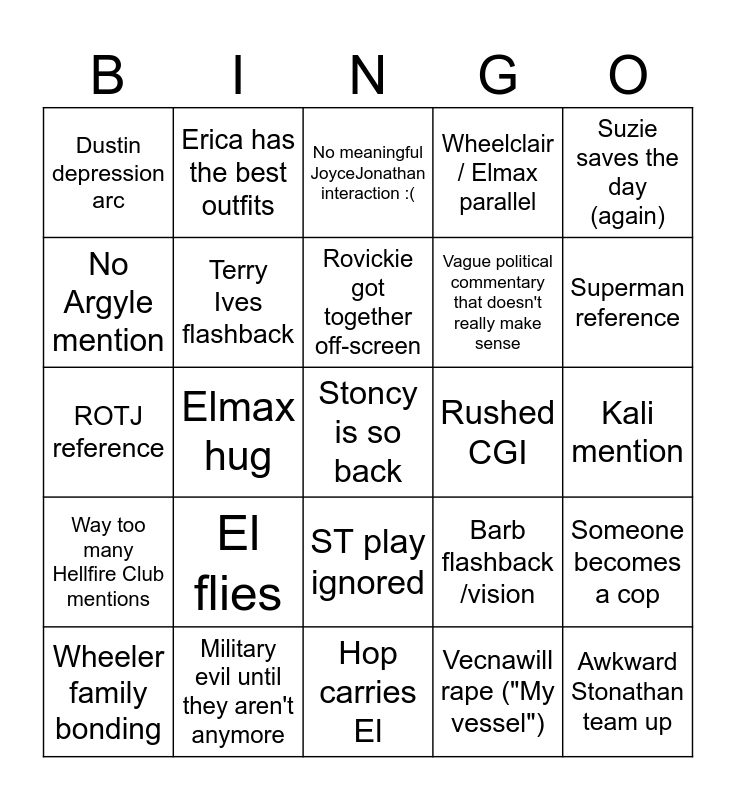 This bingo card has a free space and 24 words: El flies, Military evil until they aren't anymore, Rovickie got together off-screen, Wheeler family bonding, Suzie saves the day (again), Dustin depression arc, No Argyle mention, Erica has the best outfits, Rushed CGI, ST play ignored, Vague political commentary that doesn't really make sense, ROTJ reference, Barb flashback /vision, Someone becomes a cop, Terry Ives flashback, Vecnawill rape ("My vessel"), Kali mention, No meaningful JoyceJonathan interaction :(, Superman reference, Elmax hug, Awkward Stonathan team up, Way too many Hellfire Club mentions, Wheelclair / Elmax parallel and Hop carries El.