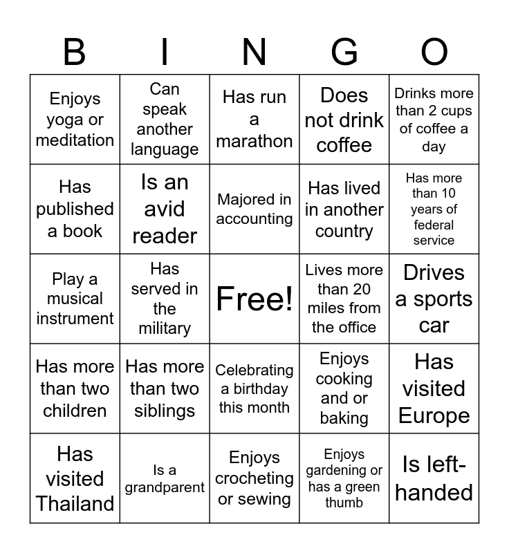 This bingo card has a free space and 24 words: Has more than two siblings, Is a grandparent, Majored in accounting, Has visited Thailand, Drinks more than 2 cups of coffee a day, Enjoys yoga or meditation, Has published a book, Can speak another language, Lives more than 20 miles from the office, Celebrating a birthday this month, Has lived in another country, Play a musical instrument, Enjoys cooking and or baking, Has visited Europe, Is an avid reader, Enjoys gardening or has a green thumb, Drives a sports car, Has run a marathon, Has more than 10 years of federal service, Has served in the military, Is left-handed, Has more than two children, Does not drink coffee and Enjoys crocheting or sewing.