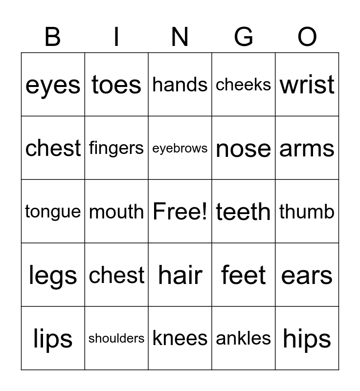 This bingo card has a free space and 24 words: chest, shoulders, eyebrows, lips, wrist, eyes, chest, toes, teeth, hair, nose, tongue, feet, ears, fingers, ankles, thumb, hands, arms, mouth, hips, legs, cheeks and knees.