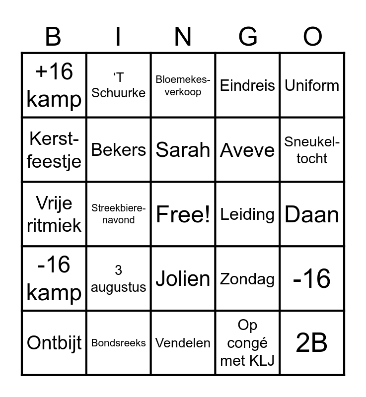 This bingo card has a free space and 90 words: Suze, Julie, Jolien, Jens, Fien, Lore, Lena, Selina, Lize, Lennert, Thibo, Florian, Mathias, Daan, Jo, Sarah, KLJ, Beveren, Mossel-festijn, Schijt je rijk, Sportfeest, Wimpelen, Vendelen, Touwtrekken, Vrije ritmiek, Bondsreeks, Kringdans, Parendans, Piramide, Atletiek, -10, -16, +16, -16 kamp, +16 kamp, Eindreis, Bloemekes-verkoop, KLJ-Kermis, Streekbiere-navond, Sneukel-tocht, Ontbijt, Kerst-feestje, Steak-festijn, 80’s, 90’s 00’s, Startdag, Zondag, Vrijdag, Leefweek, -10 weekend, +16 weekend, 24u-spel, Aveve, Van Moer H & Zn, Green-it, Vespa Waasland, Jeugd-beweging, Leiding, Hoofdleiding, Leden, VZW, Lokaal, Sint-Maarten, Lesseliers-dreef, ‘T groep, Dansen, Helpers, Activiteiten, Op congé met KLJ, Kampwater, Zomer, 3 augustus, 2B, Verhuur, Feestweekend, ‘T Schuurke, Bekers, Sportief, Vrienden, Familie, Finale, Sjaaltje, Uniform, Vendelpak, Tamboer, Trommel, Hulshout, Oefenen, Vendelband, KLJ Logo and Blote voeten.