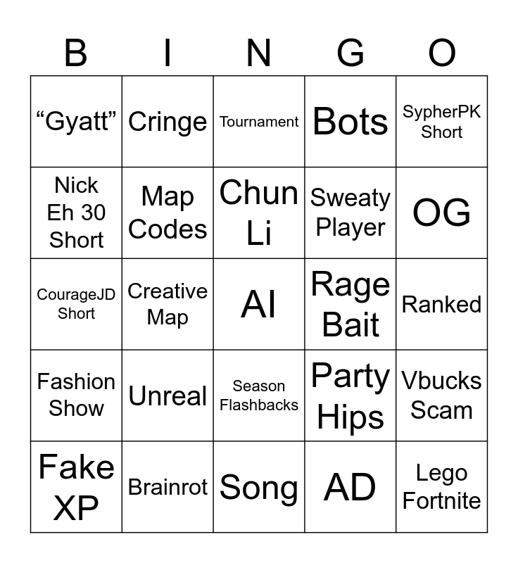 This bingo card has a free space and 24 words: Unreal, Brainrot, Chun Li, Fake XP, SypherPK Short, “Gyatt”, Nick Eh 30 Short, Cringe, Rage Bait, Season Flashbacks, Sweaty Player, CourageJD Short, Party Hips, Vbucks Scam, Map Codes, AD, Ranked, Tournament, OG, Creative Map, Lego Fortnite, Fashion Show, Bots and Song.