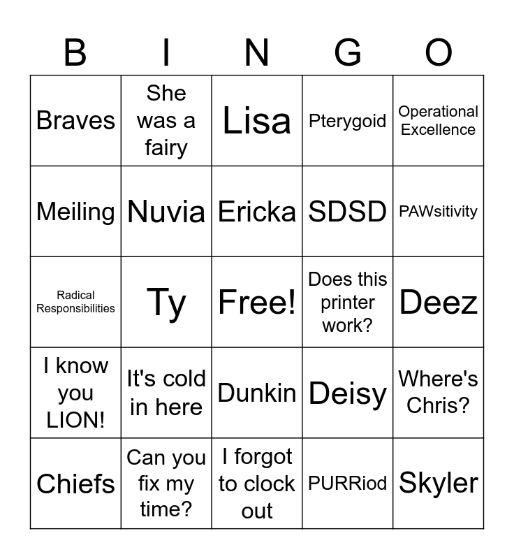 This bingo card has a free space and 77 words: Meowietta, Catalie, Lisa, Rae, Chris, Dr.T, Dr. Williams, Dr. Cho, Tina, Tasha, Ro, CiCi, Ericka, Meiling, Stephy, Ty, Justin, Skyler, MVP Teamwork, Operational Excellence, Patient Obsession, Radical Responsibilities, Nuvia, She was a fairy, Pterygoid, Zygo, It wasn't me, I didn't do it, Monster energy drink, QT, I'm waiting on a doctor, 24Z, Yenner, Deisy, PAWsitivity, SDSD, Eagerness to invent, Are you clocked out?, Deez, PURRiod, Secret shopper, Eagles, Cowboys, Jaguars, Lions, Falcons, Chiefs, Braves, Med Clearance, TAF, Snickers, Dunkin, Starbucks, Patterson, Intech, Meow Monday, Toe bean Tuesday, Whisker Wednesday, Thursday Purrsday, Feline Friday, It's cold in here, Bonus, Golden Friday, #Baddies, Have you seen my phone?, Hey Siri, Where's Ty?, Does this printer work?, Ya feel me?, No ma'am, no ham, no turkey, SML MKR, Where's Chris?, I know you LION!, Can you fix my time?, I forgot to clock in, I forgot to clock out and Rebecca.