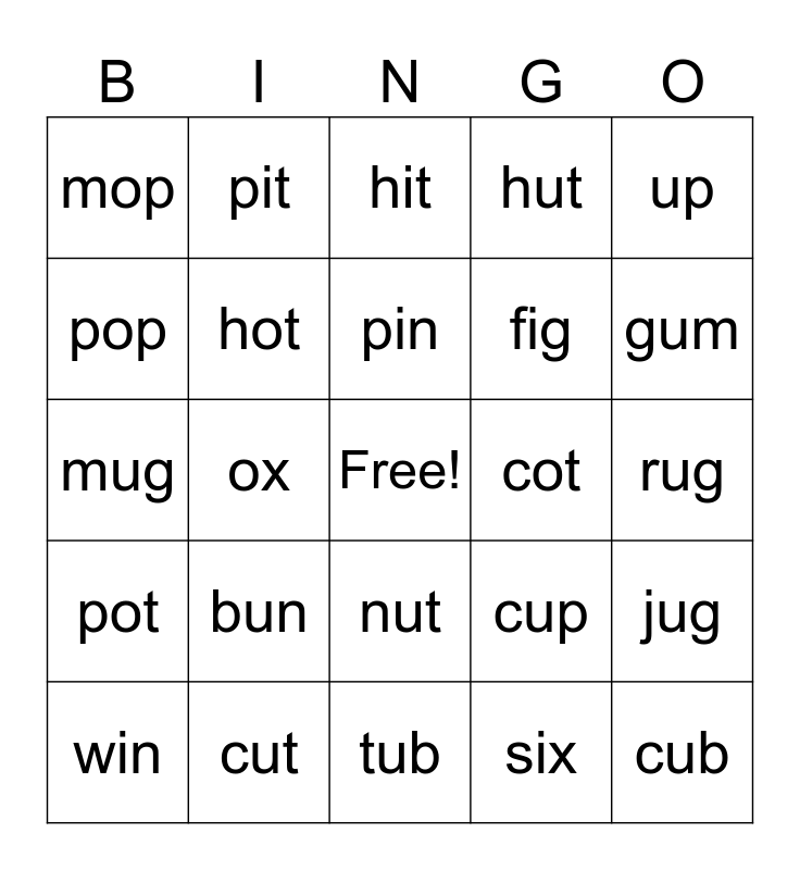 This bingo card has a free space and 24 words: bun, cut, pin, win, up, mop, pop, pit, cot, nut, fig, mug, cup, jug, hot, six, rug, hit, gum, ox, cub, pot, hut and tub.