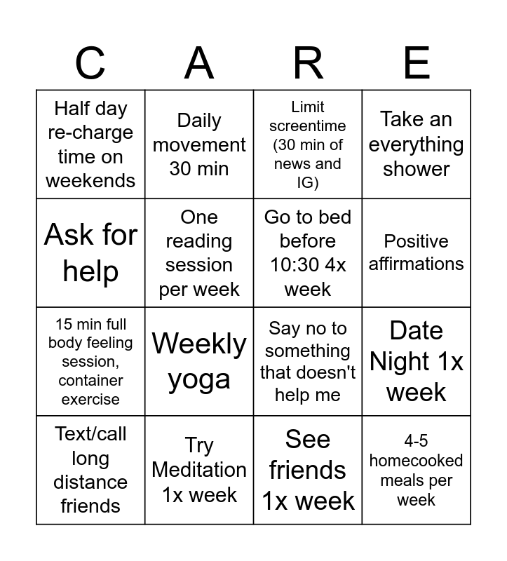 This bingo card has 16 words: Try Meditation 1x week, Date Night 1x week, Limit screentime (30 min of news and IG), Half day re-charge time on weekends, 15 min full body feeling session, container exercise, Daily movement 30 min, Say no to something that doesn't help me, See friends 1x week, Ask for help, One reading session per week, Text/call long distance friends, Take an everything shower, Weekly yoga, Positive affirmations, Go to bed before 10:30 4x week and 4-5 homecooked meals per week.