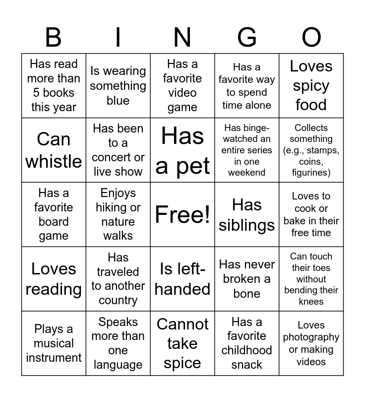 This bingo card has a free space and 24 words: Has traveled to another country, Speaks more than one language, Has a pet, Plays a musical instrument, Loves spicy food, Has read more than 5 books this year, Can whistle, Is wearing something blue, Has siblings, Is left-handed, Has binge-watched an entire series in one weekend, Has a favorite board game, Has never broken a bone, Can touch their toes without bending their knees, Has been to a concert or live show, Has a favorite childhood snack, Loves to cook or bake in their free time, Has a favorite video game, Collects something (e.g., stamps, coins, figurines), Enjoys hiking or nature walks, Loves photography or making videos, Loves reading, Has a favorite way to spend time alone and Cannot take spice.