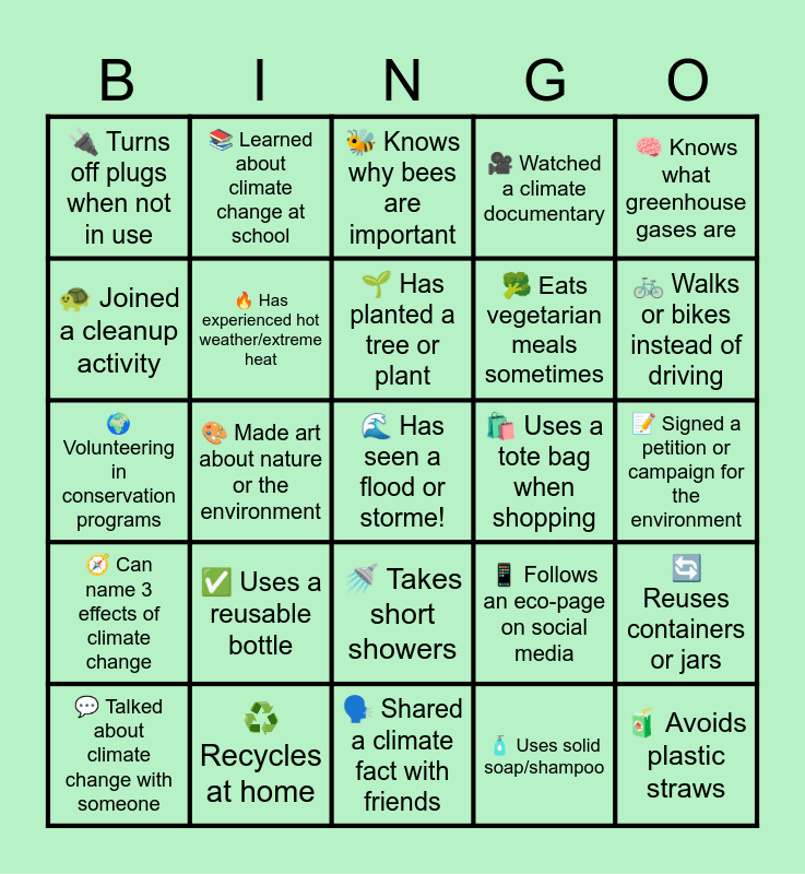 This bingo card has a free space and 24 words: โ Uses a reusable bottle, โป๏ธ Recycles at home, ๐ฑ Has planted a tree or plant, ๐ฌ Talked about climate change with someone, ๐ง Knows what greenhouse gases are, ๐ Turns off plugs when not in use, ๐ข Joined a cleanup activity, ๐ Learned about climate change at school, ๐๏ธ Uses a tote bag when shopping, ๐ฟ Takes short showers, ๐ฅฆ Eats vegetarian meals sometimes, ๐ Volunteering in conservation programs, ๐ฑ Follows an eco-page on social media, ๐ Reuses containers or jars, ๐ฅ Has experienced hot weather/extreme heat, ๐งด Uses solid soap/shampoo, ๐ Signed a petition or campaign for the environment, ๐ Knows why bees are important, ๐ฒ Walks or bikes instead of driving, ๐จ Made art about nature or the environment, ๐ง Avoids plastic straws, ๐งญ Can name 3 effects of climate change, ๐ฅ Watched a climate documentary and ๐ฃ๏ธ Shared a climate fact with friends.