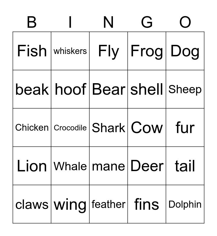 This bingo card has 36 words: Free!, paw, nostril, hoof, Deer, Lion, Bear, Monkey, Dog, Snake, Crocodile, Frog, Cat, Cow, Sheep, Fish, Dolphin, Whale, Shark, Fly, fur, tail, wing, claws, feather, whiskers, Chicken, Bird, shell, beak, scales, trunk, fins, mane, Butterfly and Bee.