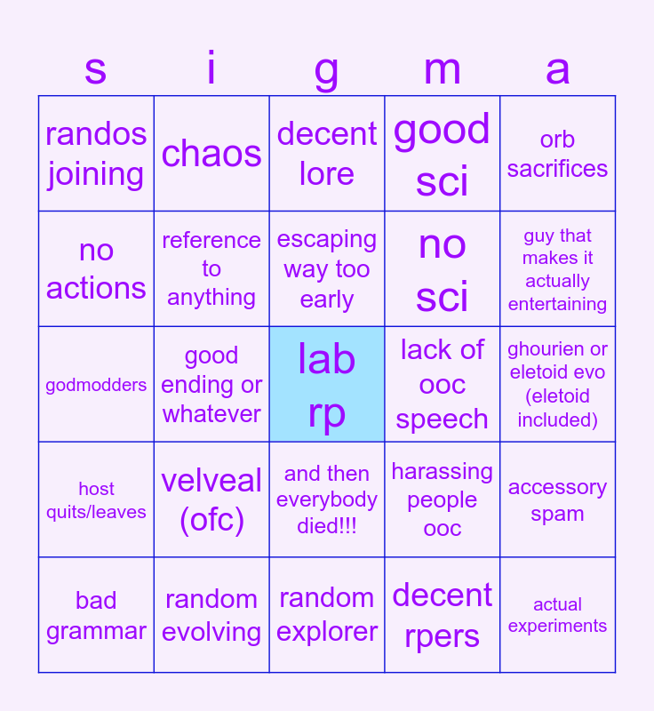 This bingo card has a free space and 24 words: velveal (ofc), random evolving, escaping way too early, bad grammar, orb sacrifices, randos joining, no actions, chaos, lack of ooc speech, and then everybody died!!!, no sci, godmodders, harassing people ooc, accessory spam, reference to anything, decent rpers, ghourien or eletoid evo (eletoid included), decent lore, guy that makes it actually entertaining, good ending or whatever, actual experiments, host quits/leaves, good sci and random explorer.