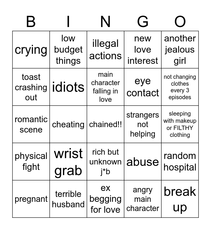 This bingo card has a free space and 24 words: wrist grab, terrible husband, main character falling in love, pregnant, another jealous girl, crying, toast crashing out, low budget things, strangers not helping, rich but unknown j*b, eye contact, romantic scene, abuse, random hospital, idiots, angry main character, sleeping with makeup or FILTHY clothing, illegal actions, not changing clothes every 3 episodes, cheating, break up, physical fight, new love interest and ex begging for love.