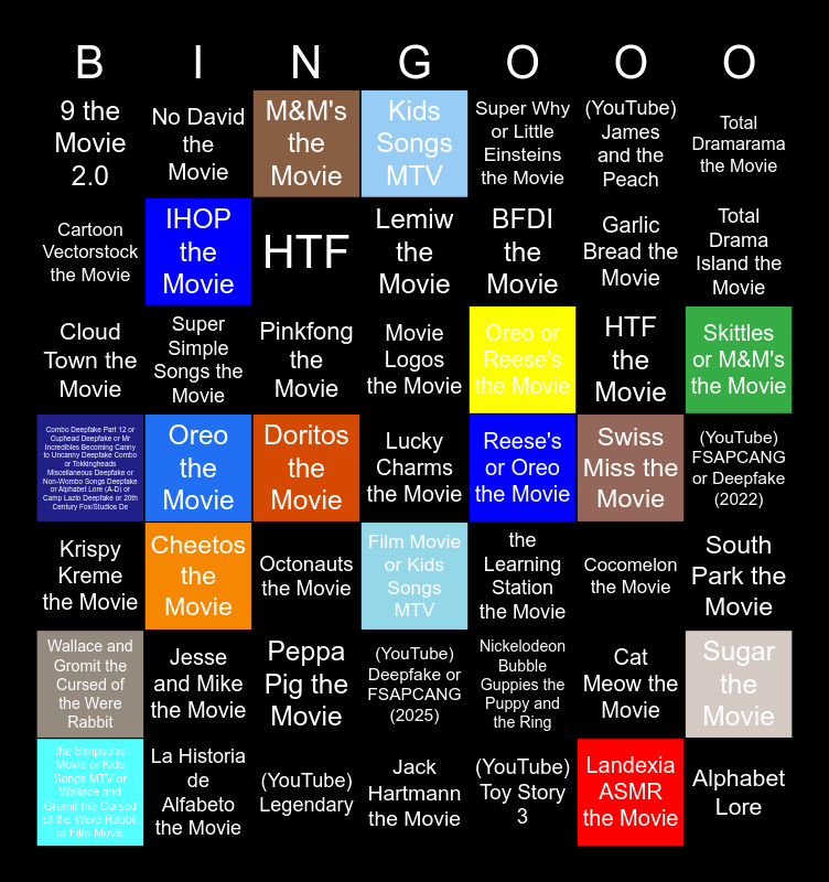 This bingo card has 112 words: Film Movie or Kids Songs MTV or Wallace and Gromit the Cursed of the Were Rabbit or the Simpsons Movie, Wallace and Gromit the Cursed of the Were Rabbit or the Simpsons Movie, Film Movie or Kids Songs MTV, Wallace and Gromit the Cursed of the Were Rabbit or the Simpsons Movie or Film Movie or Kids Songs MTV, Kids Songs MTV or the Simpsons Movie, the Simpsons Movie, Kids Songs MTV, the Simpsons Movie or Kids Songs MTV, Film Movie or Wallace and Gromit the Cursed of the Were Rabbit, Wallace and Gromit the Cursed of the Were Rabbit, Film Movie, Wallace and Gromit the Cursed of the Were Rabbit or Film Movie, Kids Songs MTV or the Simpsons Movie or Film Movie or Wallace and Gromit the Cursed of the Were Rabbit, the Simpsons Movie or Wallace and Gromit the Cursed of the Were Rabbit, Kids Songs MTV or Film Movie, the Simpsons Movie or Kids Songs MTV or Wallace and Gromit the Cursed of the Were Rabbit or Film Movie, Movie Logos the Movie, Preview 1280 in 2x, Wallace and Gromit Grand Adventures in 2x, Goodnites the Movie, Skittles or M&M's the Movie, M&M's the Movie, Skittles the Movie, M&M'S or Skittles the Movie, Landexia ASMR the Movie, Super Simple Songs the Movie, Combo Deepfake Part 12 or Cuphead Deepfake or Mr Incredibles Becoming Canny to Uncanny Deepfake Combo or Tokkingheads Miscellaneous Deepfake or Non-Wombo Songs Deepfake or Alphabet Lore (A-D) or Camp Lazlo Deepfake or 20th Century Fox/Studios De, the Learning Station the Movie, PJ Masks the Movie, Lego the Movie, 9 the Movie 2.0, BFDI the Movie, Lucky Charms the Movie, DVD the Movie, Cat Meow the Movie, (YouTube) FSAPCANG or Deepfake (2022), (YouTube) Deepfake (2023), (YouTube) FSAPCANG (2024), (YouTube) Deepfake or FSAPCANG (2025), Red Robin the Movie, Google Street See More Date the Movie, SMG4 the Movie, Peppa Pig the Movie, Pocoyo the Movie, Total Drama Island the Movie, Jimmy Kimmel Halloween Candy the Movie, Reese's or Oreo the Movie, Oreo the Movie, Reese's the Movie, Oreo or Reese's the Movie, Cheetos or Doritos the Movie, Doritos the Movie, Cheetos the Movie, Doritos or Cheetos the Movie, Numberblocks the Movie, Little Caeser's the Movie, No David the Movie, Numa Cat the Movie, Cinnamon Toast Crunch the Movie, HTF the Movie, IHOP the Movie, Cinnamon Rolls the Movie, McDonald's the Movie, Video Editor: BFDI Definitely Not a Shadbid, Logoliers, South Park the Movie, TAWOG the Movie, Lemiw the Movie, Alphabet Lore, BFDI, Total Dramarama, HTF, Nickelodeon Bubble Guppies the Puppy and the Ring, Fruit Punch the Movie, Bob the Train the Movie, Pinkfong the Movie, Octonauts the Movie, World of Movie Studios as Compilation by AI the Movie, Erica Cartman Big Pumpkin the Movie, Krispy Kreme the Movie, Garlic Bread the Movie, Sprunki the Movie, Cartoon Vectorstock the Movie, Total Dramarama the Movie, Cocomelon the Movie, Annoying Orange the Movie, Jack Hartmann the Movie, Cookies the Movie, Gonoodle the Movie, Mooseclumps the Movie, Kyle Istook the Movie, Super Why or Little Einsteins the Movie, Little Einsteins the Movie, Super Why the Movie, Little Einsteins or Super Why the Movie, Cloud Town the Movie, La Historia de Alfabeto the Movie, Jesse and Mike the Movie, Kool-Aid the Movie, Storybots the Movie, Steven Universe the Movie, Swiss Miss the Movie, Sugar the Movie, Crying Compilation, Fruit Loops the Movie, (YouTube) Toy Story 3, (YouTube) James and the Peach, (YouTube) Elemental, (YouTube) Coraline, (YouTube) Legendary, (YouTube) Inside Out and (YouTube) Lightyear.