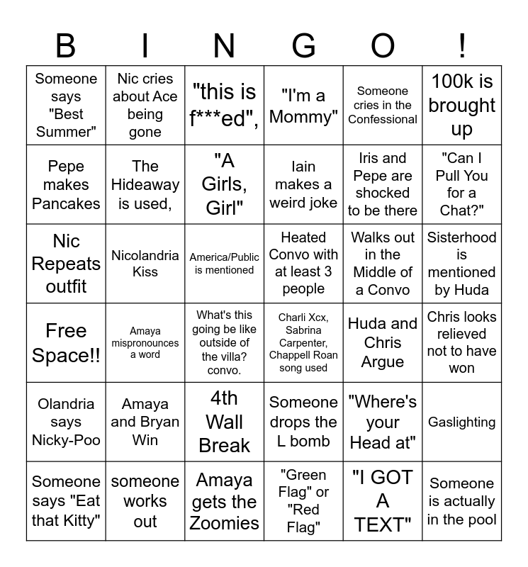 This bingo card has 38 words: Gaslighting, "Where's your Head at", Someone is actually in the pool, Pepe makes Pancakes, Amaya mispronounces a word, Walks out in the Middle of a Convo, The Hideaway is used,, "I GOT A TEXT", Someone cries in the Confessional, "A Girls, Girl", "Can I Pull You for a Chat?", "I'm a Mommy", Nic Repeats outfit, America/Public is mentioned, 100k is brought up, Heated Convo with at least 3 people, 4th Wall Break, "this is f***ed",, someone works out, Nicolandria Kiss, Someone says "Best Summer", Charli Xcx, Sabrina Carpenter, Chappell Roan song used, Iain makes a weird joke, What's this going be like outside of the villa? convo., Amaya gets the Zoomies, Huda and Chris Argue, Olandria says Nicky-Poo, "Green Flag" or "Red Flag", Someone says "Eat that Kitty", Someone drops the L bomb, Finale Date, Sisterhood is mentioned by Huda, Chris looks relieved not to have won, Nic cries about Ace being gone, Amaya and Bryan Win, Free Space!!, Iris and Pepe are shocked to be there and “There’s been a lot of up’s and Down”s.